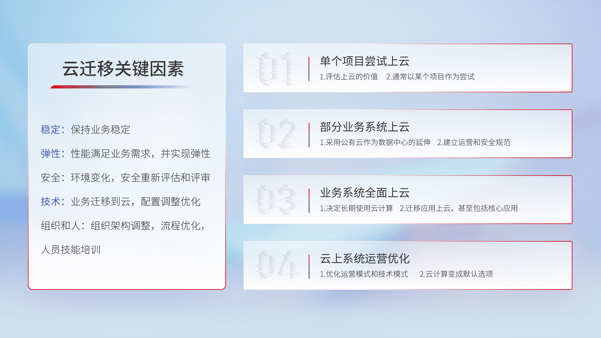 结合实际业务,,,,从规划设计、、云平台选型、、、、云原生改造、、、数据迁移、、集成交付,,,,迁移全过程为客户识别最佳上云路径,,做好风险识别管理,,设计网络架构、、、身份权限、、安全审计合规、、、、操作审计、、、、日志审计、、、、监控告警策略、、、、多站点容灾设计等,,,,对云上基础设施进行整体规划,,,,提升IT治理水平,,以满足弹性、、、、高可用、、、高性能的需求。。。