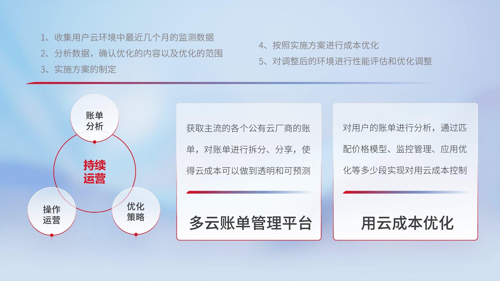 通过多云纳管,,,以统一的资源数据模型把客户的云资源进行抽象和封装,,,,进而实现对多云资源的统一操作,,,保障云资源管理的可靠性、、稳定性与可用性。。量身定制化运维内容,,配置、、开发运维、、、、补丁管理、、备份、、、监控、、、、认证和访问管理、、、审计和日常巡检等,,,保障在用云过程中的可靠度,,稳定度以及高可用率。。。。